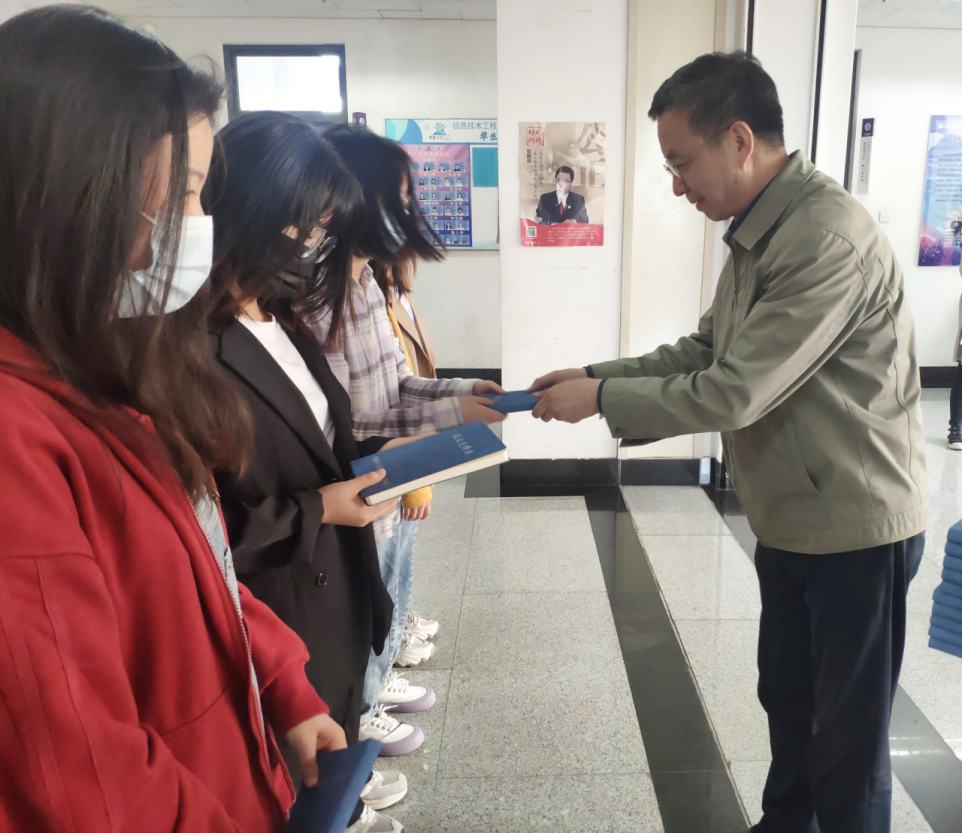 石连栓为受表彰同学颁发“就业先锋者”定制笔记本。