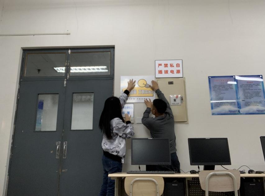 10月22日下午,计算机基础教工党支部全体党员对公司三楼的六间机房进行清扫,并针对教室中存在的部分不文明行为设计制作了文明宣传标语,张贴在机房醒目位置。通过此次志愿服务活动,增强了教师党员维护教室干净整洁的“责任心”和为人民服务的“初心”。